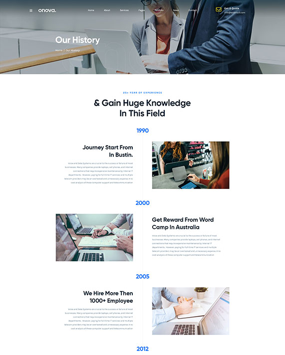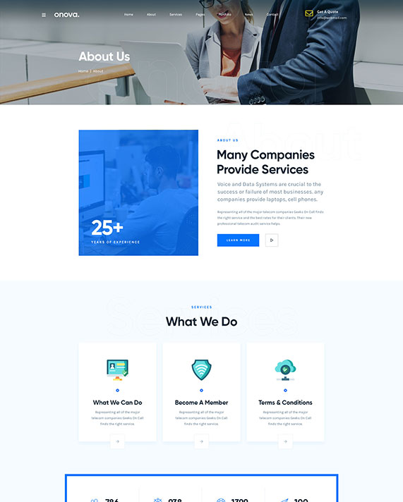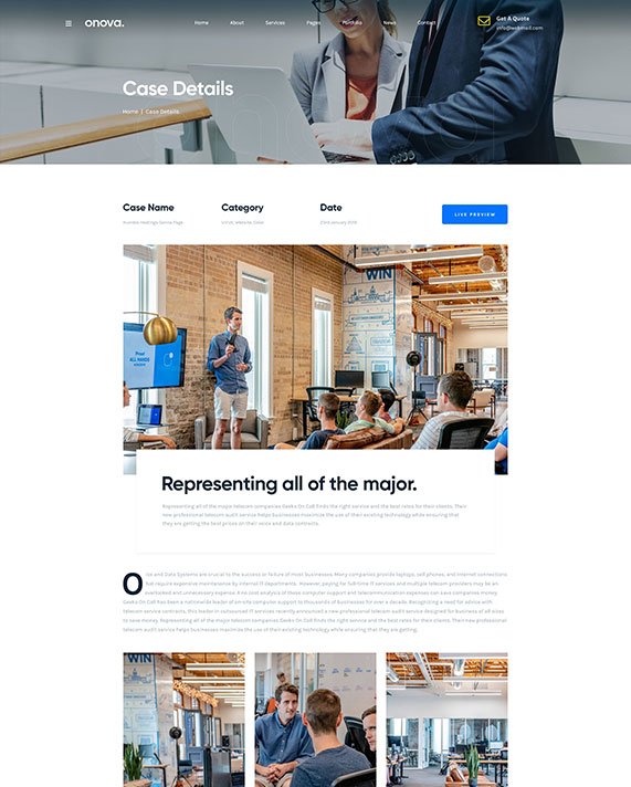 Onova is full of great and awesome predesigned inner pages, as well as services, case studies, blog, and shop layouts to ensure you can set up a website in no time.